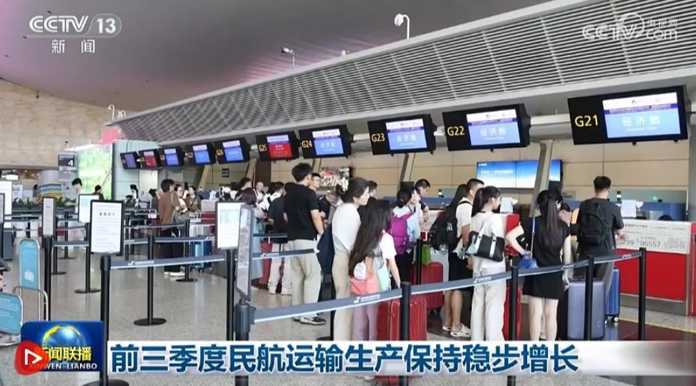 央视新闻(新闻联播):民航局记者采访发现,今年前三季度,民航运输生产保持平稳增长。全行业已完成运输...