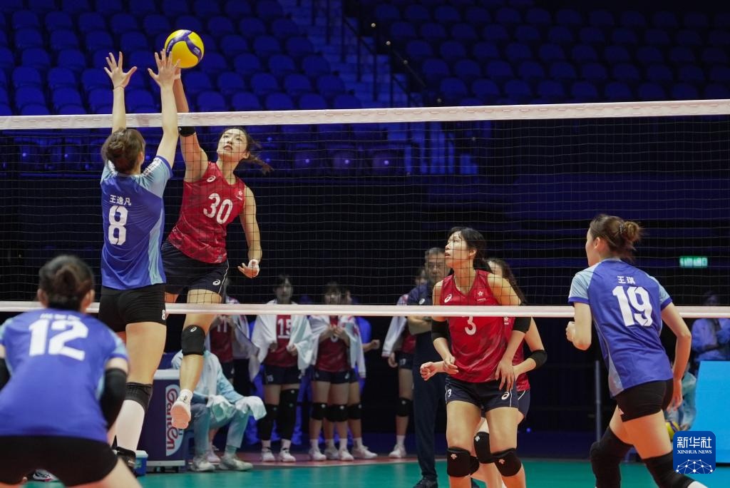 11月8日,香港队球员严永妮(右上)在比赛中跳起击球。当日,在澳门举行的第十五届全运会女排成人组比赛B组比赛中,广东队以3-0击败澳门队。新华社报道称,11月8日,香港队球员在比赛中相互鼓励。当日,在澳门举行的第十五届全运会女排成人组比赛B组比赛中,广东队以3-0击败澳门队。新华社